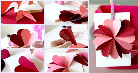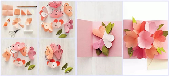 并按如图所示粘成一个大大的花朵,贴在封面上,一个满是爱心的贺卡就做好了。