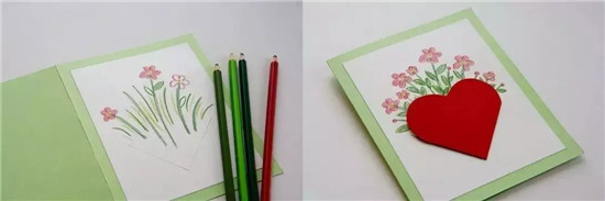 利用彩色铅笔在白色卡纸上手绘一些小花。 如下图位置粘贴心形。立体爱心贺卡就制作完成了~