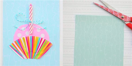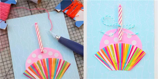 下面将生日蜡烛粘到贺卡上面,蜡烛有重量,所以这里一定要将蜡烛粘牢。如果胶棒不管用,也可以用强力胶来粘贴。在蜡烛上面系上一根彩色的绳子就更漂亮啦,然后翻开你的贺卡,画一些画,写一些祝福就完成啦~