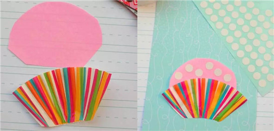 然后将蛋糕纸托铺平,呈圆形并且对折,如果没有纸托也可以用彩纸剪成这种纸杯蛋糕的纸杯的样子,将粉色纸张剪成椭圆。将粉色纸张及蛋糕纸托粘贴在贺卡封面上,纸托要粘贴在粉色纸张的上面,形成遮挡关系,在粉色纸张的上面粘上白色的小圆片,小圆片用白纸剪一些粘贴即可。