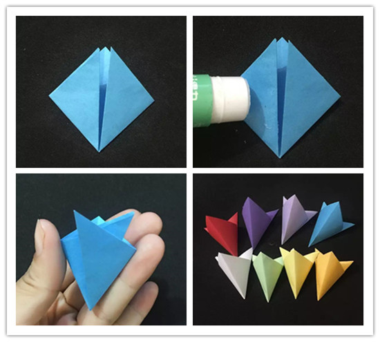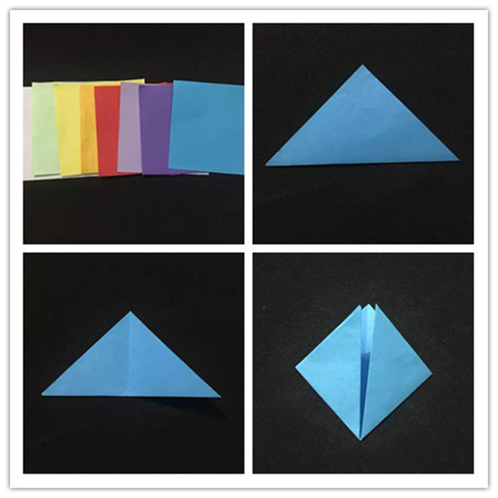 制作步骤:彩色正方形折纸,一切四,取八个不同的颜色。