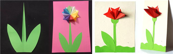 贺卡的两侧各粘有一半的花朵,这样,打开贺卡的时候,花朵也就随之盛开了。