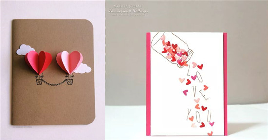 发散思维,心形贺卡的造型变幻无穷!把心形粘贴成这样的爱心热气球造型。或者从瓶子里道出一颗颗小爱心,也是非常赞呢!