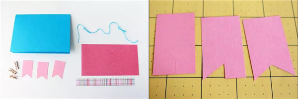 1、按下图所示,将不同的卡纸剪裁好以备使用。在三张小长方形卡纸的下面剪出三角形的形状,这样表彰缎带的样子就出来了~