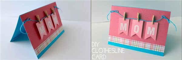 2、把线两端系成蝴蝶结粘在已经做好的贺卡上。把夹子和妈妈的纸片夹在线上,一个贺卡就做好了,怎么样?