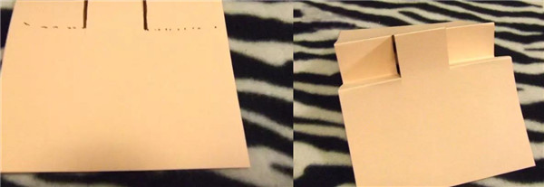 制作步骤:首先准备一张卡纸,一张彩纸,大小一致,分别对折,将彩纸封口的一边按照下图实线处剪开,虚线处朝着内侧折,如图。