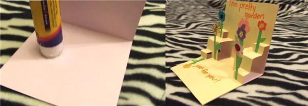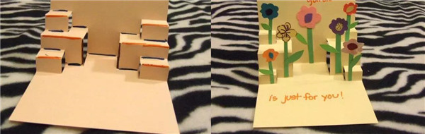 将贺卡翻过来,按照同样的方法,将阶梯进一步升级。在彩色卡纸上剪一些花杆,叶子,和不同颜色不同姿态的花朵,组合固定在阶梯上,让其形成立体的花丛效果,如图,并且在空余的位置写上一些祝福。