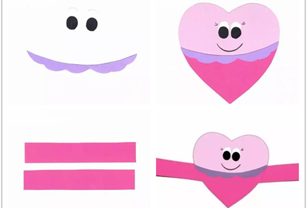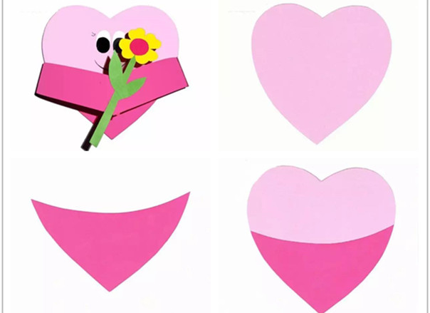 制作步骤:剪一个粉色的爱心,娃娃的衣服:再剪一样大小的爱心,如图剪去上半部分。组合粘贴。