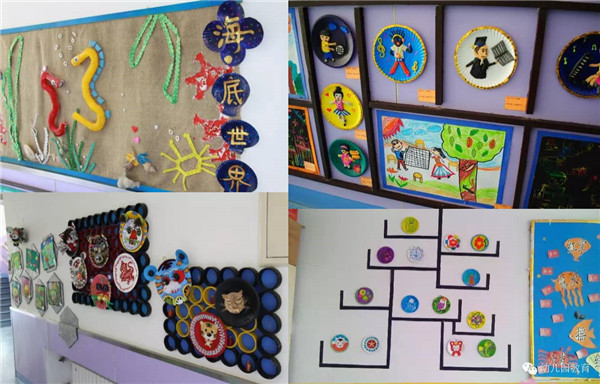 1、简单的布艺手工环创设计,海底世界能应景出夏季的清凉感,当采用实用的纸盘手做环创,对于主题墙、宣传栏都是很不错的选择!