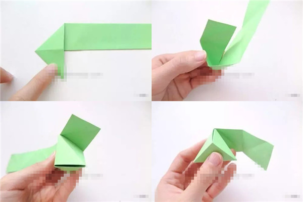 再往右折出另外一个三角形。打开刚刚的第二个三角形,接着往下折出一个三角形。
