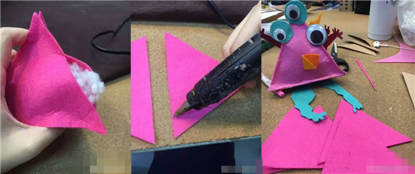 利用各色的不织布,先用铅笔在不织布上勾勒出你想要的的大致形状。它们有什么特征?将这些小细节也用笔勾勒,勾勒好的形状剪下来,粘贴组合...