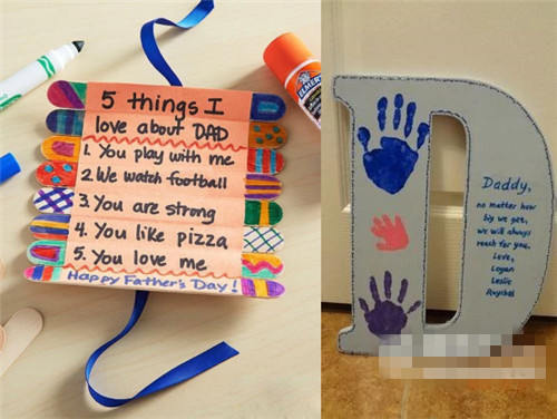 雪糕棍加一张卡纸,写上父亲节祝福语装饰画好雪糕棍,是不是简单,加一根缎带就变书简了!还有手掌DIY、大手牵小手,跟着爸爸走……成长路上不艰苦。