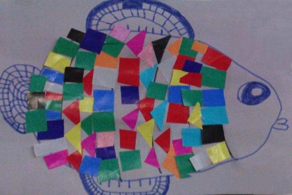 2、然后让孩子们选择自己喜欢的颜色,形状,将大鲨鱼的身体部位用这些材质粘粘好。