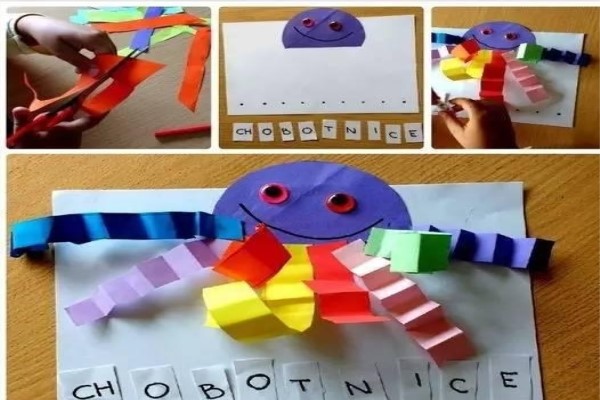 4、最后,再让孩子们选择不同颜色的材质,老师可以给他们剪成条状,然后让孩子们胶棒把他们粘在章鱼的头下方,最后可以让孩子们在终于头的上面画上眼睛,嘴巴等。让孩子们发挥自己的想象力,这样非常简单的章鱼手工作品就完成了。