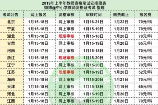 就今天,大家最关心的2019上半年教师资格证报名时间以及笔试时间已经公布了,就目前各城市和地区在本月的1月15 -1月18日期间开始网上报名,而四川地区教师资格证网上报名时间为1月15日-1月17日、审核时间为1月15日-1月22日截止,四川地区的审核时间是1月18-1月19日两天、缴费截止时间在1月21日。