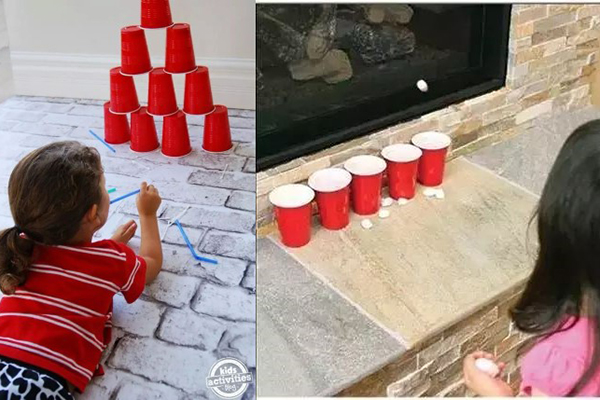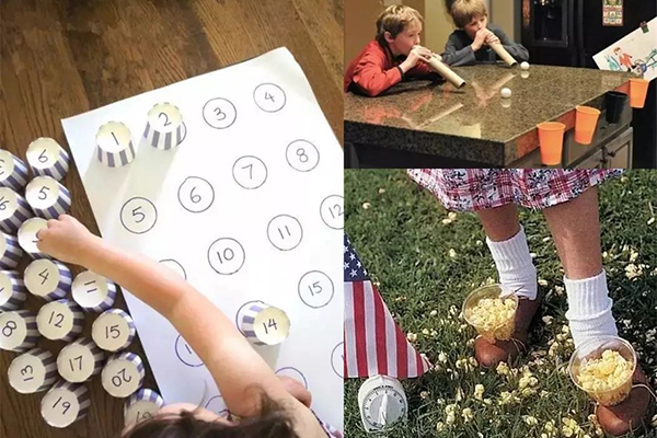 这也是一个适合幼儿园室内外团体玩的游戏,但是老师要先设计一下。首先用两根线穿过纸杯,方便杯子可以绑在幼儿们的脚上,这样的纸杯两个为一对,教师可以多做几个方便团体一起玩儿。游戏玩法很简单,只需要在杯子中装一些东西,绑在幼儿脚背上,让幼儿“负重前行”,看看谁用最短的时间最先将纸杯中的东西运到终点,运的最多的就获胜。
