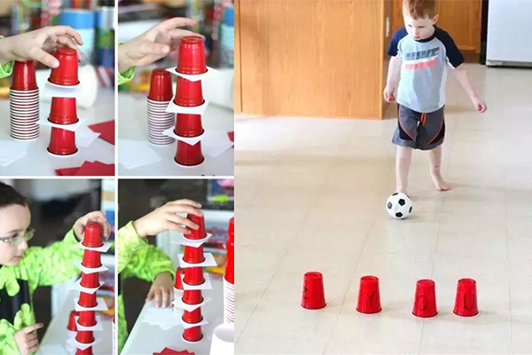 这也是一个适合幼儿园团体玩的游戏,可以作为室内游戏和室外游戏进行。教师先在地面上摆出相应间隔的一排纸杯,然后准备一个小足球,幼儿用脚踢足球,让足球以S型的走向绕过纸杯。团体玩的话可以多准备几排纸杯,将幼儿分组进行游戏,也可以采用比赛的机制,比一比谁先带球顺利达到终点。
