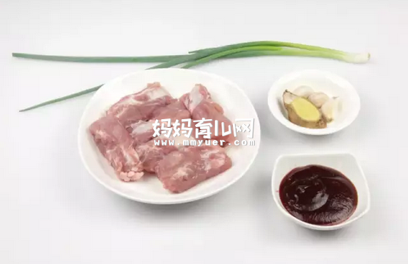 猪肋排500克、大葱1段、姜1小块、大蒜3瓣、排骨酱3汤匙、料酒2茶匙、盐1/2茶匙、白糖1/2茶匙