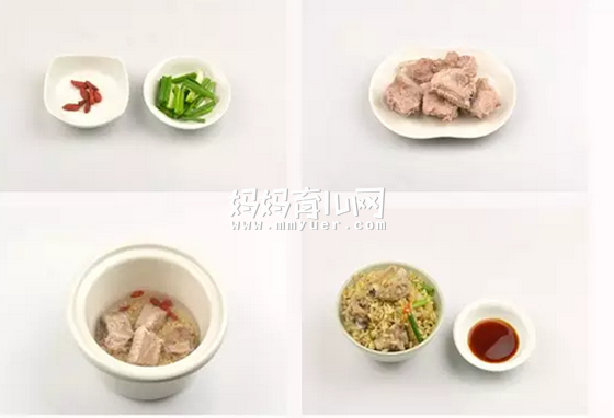 排骨200克、糙米240克、葱1根、枸杞少许、酱油1茶匙