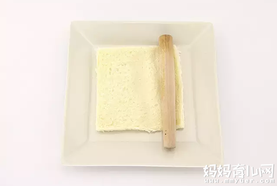 2、吐司切去四边硬边,用桿面棍稍微压成扁实状。