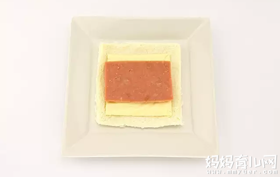 3、将一片火腿片与奶酪片放在吐司上。