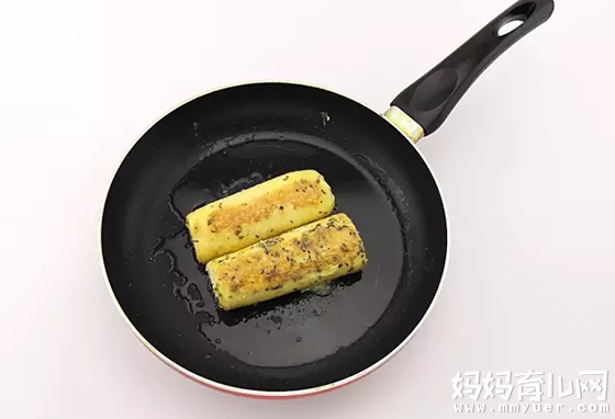 7、将面包煎到两面金黄即可盛入盘中。