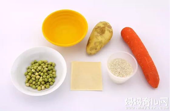 白米30克、宝宝奶酪半片、土豆10克、胡萝卜10克、豌豆10克、水130毫升