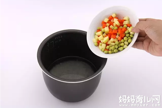 5、将白米、土豆、胡萝卜和豌豆连同水,一起放入电饭锅焖熟成软饭。
