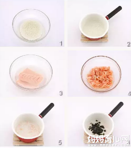 白米60克、三文鱼肉3汤匙、水600毫升、紫菜碎1汤匙