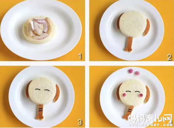2.再盖上一片用土司模具压出的圆形面包。将面包边做成大象的耳朵和鼻子。