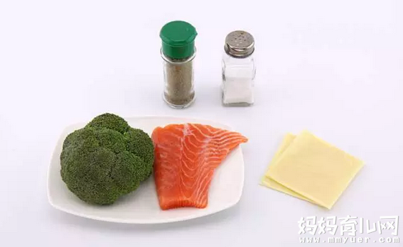 三文鱼500克、西兰花200克、芝士片2片、黑胡椒粉1克、盐1小撮