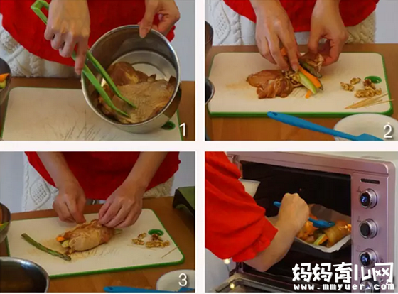 3.把腌制好的鸡肉摊平,中间放置配菜,卷起,用牙签固定或棉线扎起来。