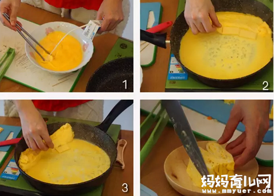 2.油热锅后倒入蛋液,半熟时卷起至锅的一边,再倒入一层蛋液,放置芝士。