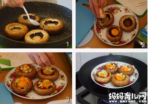 珍宝菇(也可以用其他菇,选个头大一点的),鸡蛋或鹌鹑蛋,盐、糖、黑胡椒适量,杂蔬粒按喜好