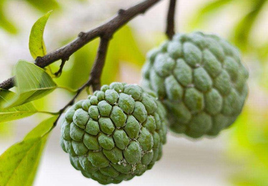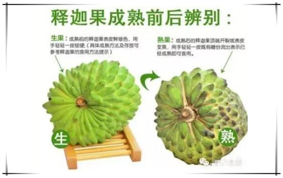已经成熟的释迦果:表皮成熟后的释迦果表皮的绿色看起来有些旧旧的,而且有发黑现象。果子表面的顶端还可能有开裂现象,用手轻轻一按,有少许糖分流出来。