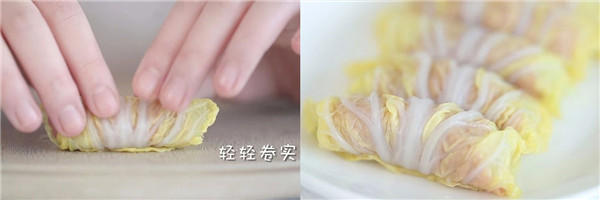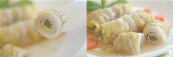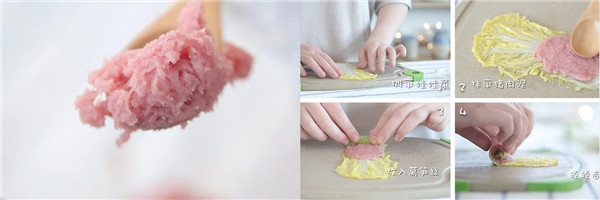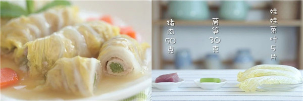 2、 馅料里的猪肉可以换成牛肉、鱼肉或虾肉,蔬菜也可以换成胡萝卜丝,芦笋丝等,但外面裹的蔬菜最好选用娃娃菜。
