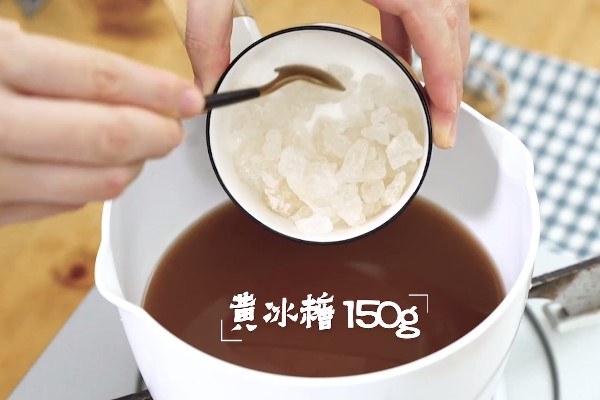 (4)放入300g的冰糖,三勺麦芽糖搅拌均匀一起慢慢熬煮;
