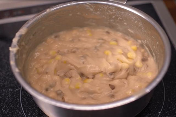 5、这时玉米蘑菇汤也大火煮开有些时间了,这时把煮好的玉米蘑菇汤分两次倒入黄油面糊中,记住一定要分两次哦。而且在倒入的过程中慢慢倒,慢慢搅拌,同时将火转至中小火耐心的慢慢熬煮。