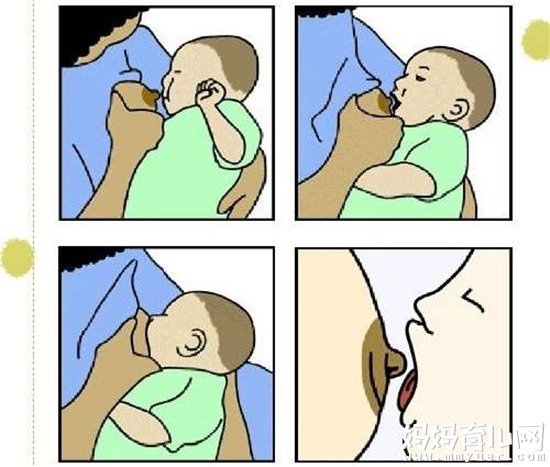 妈妈用乳头刺激婴儿口周皮肤,待婴儿张开嘴时,把乳头和部分乳晕送入婴儿口中。