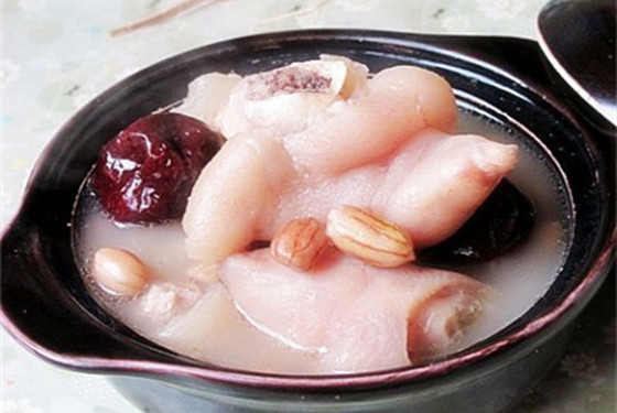 猪蹄治净切成块氽水,依次加入月子米酒、花生、爆老姜、催乳汤、入砂锅煮沸后转小火炖至猪蹄熟烂脱骨,关火后15分钟后即可食用。