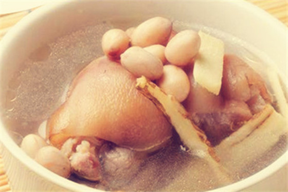 材料:材料:猪蹄2只、花生米100克、黄豆100克、龙眼肉15克、陈皮1片、姜片2片、盐适量。