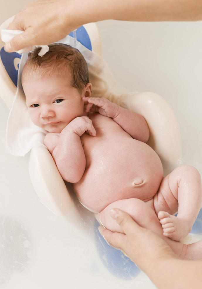 给刚生下来的新生儿洗澡时要注意托住新生儿的头,刚生下来脖子没有什么力气,更加没有力气坐稳了,洗澡时不宜放入浴盆内,而且要特别注意防止滑脱摔伤、淹溺及脐带、外耳道进水。所以要用手挟扶着宝宝,给宝宝一个安全的环境去洗澡,水不要流到耳朵和眼睛里面去了。