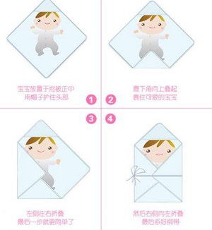 冬季室温较低时,可用被子的一角绕宝宝头围成半圆形帽状;如果室温能达到20℃左右则不必围头,可将包被角下折,使宝宝头、上肢露在外面。包被包裹松紧要适度,太松或太紧都会令宝宝感到不舒服,包被外面也不要用布带紧束捆绑。捆绑过紧不利于宝宝四肢自由活动,影响生长发育。夏季天气较热时,只需给宝宝穿上单薄的衣服或是包一条纯棉质料的毛巾就可以了。