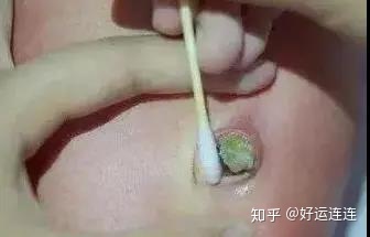 如果局部有发红或者脓性分泌物,可以用棉签蘸碘伏后深入脐窝绕上一圈,然后更换新的碘伏棉签,重复上面的动作,如此重复2~3次,确保脐部的分泌物被清理干净。