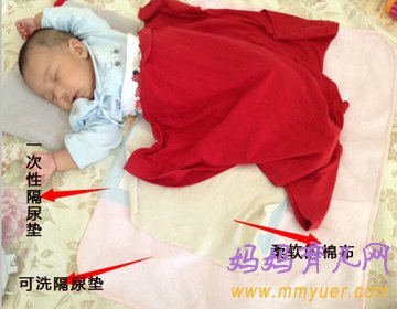 白天床上垫“可洗隔尿垫”(新生儿用的一次性隔尿垫比较小,避免宝宝尿尿溅到床上,先铺一层),上面放“一次性隔尿垫”(为避免宝宝皮肤敏感,我在上面还铺上一层柔软的棉布),之后就可以把裹了尿布的宝宝放上面了(切记,尿湿了马上换掉)。一次性隔尿垫,淘宝天猫上有卖,赶上促销的时候买的,算下来一片才4毛钱,很经济实惠。品牌,我用的是“妮好”,上一帖有拍照片。