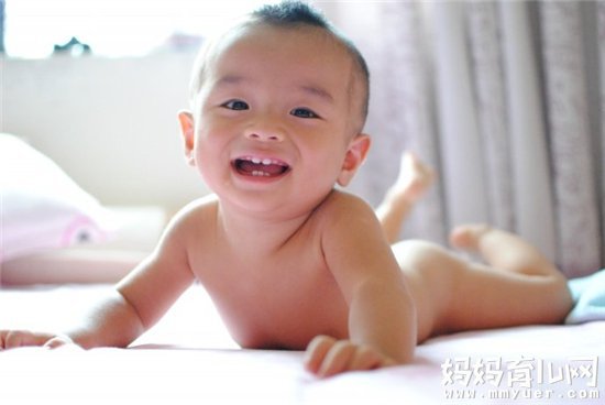 妈妈双手放在宝宝脚底下,如果宝宝伸右手,妈妈就推一下左脚,让宝宝学习正确的爬行。