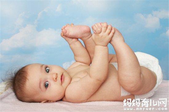 清洁完前阴部之后妈妈一只手握住宝宝脚踝,将食指放在两踝之间,以防宝宝的双踝相碰而擦伤。