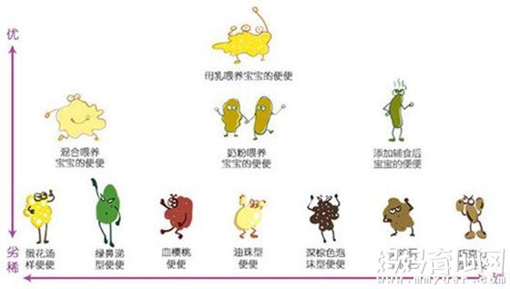 (1)宝宝从4个月开始添加辅食,随着宝宝辅食(米粉和香蕉泥之类的食物)数量和种类的增多,宝宝便性开始慢慢接近成人,开始变得颜色较暗。宝宝吃辅食后的大便往往是棕色或深棕色,比花生酱稠,但仍然是糊状