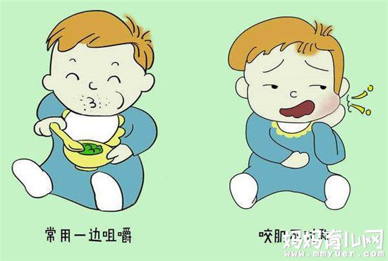 2、长牙期间,有些宝宝会喜欢咬手指,如果不加以干预的话,也是会使上门牙前突,下门牙变短,出现小口颌畸形。