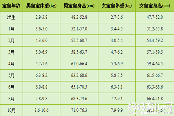 生长指标:男宝宝体重4.69-9.37kg,身长55.3-69.0cm;女宝宝体重4.40-8.71kg,身长54.2-67.5cm。